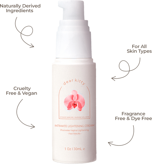 Do you need a 100% natural boost in lightening and brightening your vaginal area? We have the solution. Dear Kitty helps women of all ages feel confident about their skin down below. Women can suffer from vaginal discoloration at any age due to shaving, waxing, ingrown hairs, hormonal imbalance, medications, chafing and lack of moisture in the area.